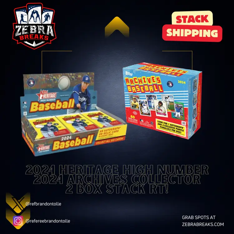 24 HHN Hobby/24 Archives Collectors STACK SHIPPING APPLIES All cards stack, you can request shipping by purchasing the "Stack Shipping Request" Item in the marketplace for Zebra Breaks specifically. Stack shipping is a $5 flat fee no matter how large your stack is. Shipping will occur the Friday/Saturday following your request if placed by Thursday night of the week you request shipping