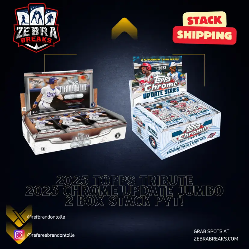 1 Box EACH of 2025 Topps Tribute & 2023 Topps Chrome Update Jumbo STACK SHIPPING APPLIES All cards stack, you can request shipping by purchasing the "Stack Shipping Request" Item in the marketplace for Zebra Breaks specifically. Stack shipping is a $5 flat fee no matter how large your stack is. Shipping will occur the Friday/Saturday following your request if placed by Thursday night of the week you request shipping.