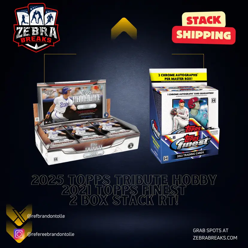 2025 Topps Tribute/2021 Topps Finest STACK SHIPPING APPLIES All cards stack, you can request shipping by purchasing the "Stack Shipping Request" Item in the marketplace for Zebra Breaks specifically. Stack shipping is a $5 flat fee no matter how large your stack is. Shipping will occur the Friday/Saturday following your request if placed by Thursday night of the week you request shipping