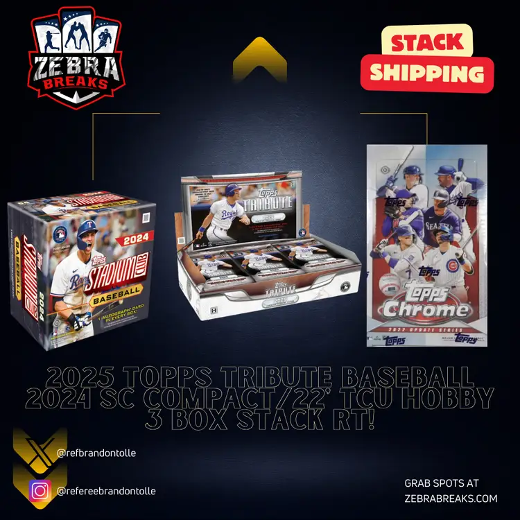 25 Tribute/24 SC Compact/22 Chrome Update Hobby STACK SHIPPING APPLIES All cards stack, you can request shipping by purchasing the "Stack Shipping Request" Item in the marketplace for Zebra Breaks specifically. Stack shipping is a $5 flat fee no matter how large your stack is. Shipping will occur the Friday/Saturday following your request if placed by Thursday night of the week you request shipping