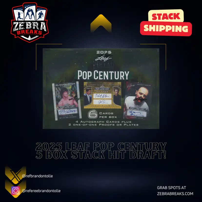 5 Boxes of 2025 Leaf Pop Century Draft Order will be Determined by Electronic Selection. Draft will occur in the Zebra Breaks portion of Discord. STACK SHIPPING APPLIES All cards stack, you can request shipping by purchasing the "Stack Shipping Request" Item in the marketplace for Zebra Breaks specifically. Stack shipping is a $5 flat fee no matter how large your stack is. Shipping will occur the Friday/Saturday following your request if placed by Thursday night of the week you request shipping