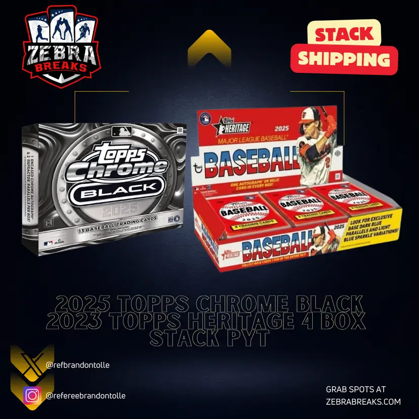 3 Boxes of 2025 Topps Chrome Black/1 Box 2025 Topps Heritage STACK SHIPPING APPLIES All cards stack, you can request shipping by purchasing the "Stack Shipping Request" Item in the marketplace for Zebra Breaks specifically. Stack shipping is a $5 flat fee no matter how large your stack is. Shipping will occur the Friday/Saturday following your request if placed by Thursday night of the week you request shipping