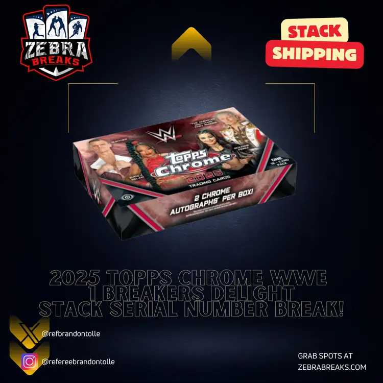 1 Box - 2025 Chrome WWE Breakers Delight Serial Number Names will be paired with a number 0-9 via Electronic Selection! STACK SHIPPING APPLIES All cards stack, you can request shipping by purchasing the "Stack Shipping Request" Item in the marketplace for Zebra Breaks specifically. Stack shipping is a $5 flat fee no matter how large your stack is. Shipping will occur the Friday/Saturday following your request if placed by Thursday night of the week you request shipping
