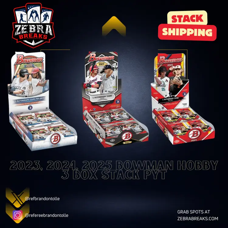 1 Box EACH of 2023, 2024 & 2025 Bowman Baseball! STACK SHIPPING APPLIES All cards stack, you can request shipping by purchasing the "Stack Shipping Request" Item in the marketplace for Zebra Breaks specifically. Stack shipping is a $5 flat fee no matter how large your stack is. Shipping will occur the Friday/Saturday following your request if placed by Thursday night of the week you request shipping
