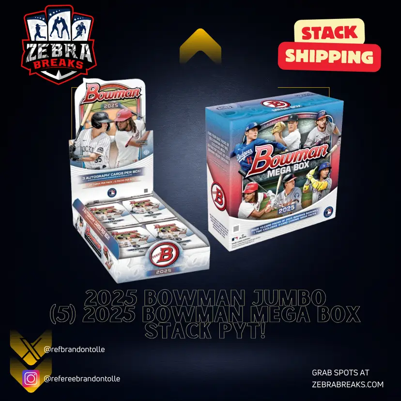 1 Jumbo & 5 Mega Boxes of 2025 Bowman Baseball STACK SHIPPING APPLIES All cards stack, you can request shipping by purchasing the "Stack Shipping Request" Item in the marketplace for Zebra Breaks specifically. Stack shipping is a $5 flat fee no matter how large your stack is. Shipping will occur the Friday/Saturday following your request if placed by Thursday night of the week you request shipping