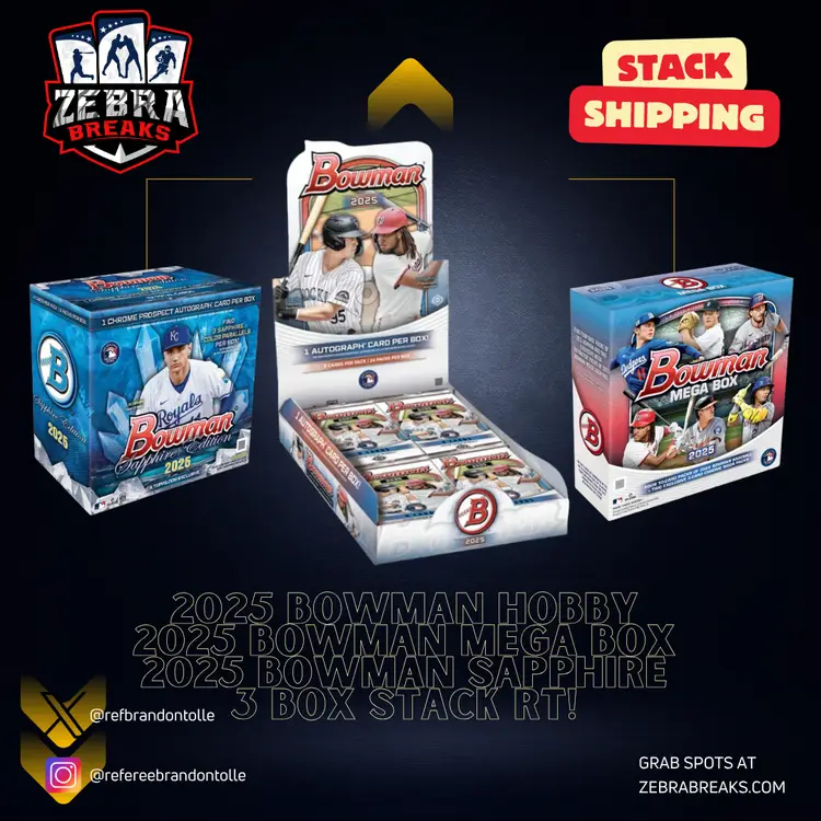 25 Bowman Sapphire/25 Bowman Hobby/25 Bowman Mega STACK SHIPPING APPLIES All cards stack, you can request shipping by purchasing the "Stack Shipping Request" Item in the marketplace for Zebra Breaks specifically. Stack shipping is a $5 flat fee no matter how large your stack is. Shipping will occur the Friday/Saturday following your request if placed by Thursday night of the week you request shipping