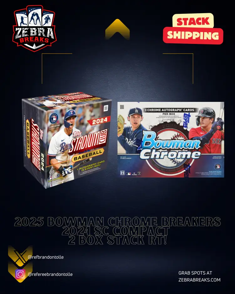 1 EACH of 2024 SC Compact & 2025 Bowman Chrome Breakers STACK SHIPPING APPLIES All cards stack, you can request shipping by purchasing the "Stack Shipping Request" Item in the marketplace for Zebra Breaks specifically. Stack shipping is a $5 flat fee no matter how large your stack is. Shipping will occur the Friday/Saturday following your request if placed by Thursday night of the week you request shipping