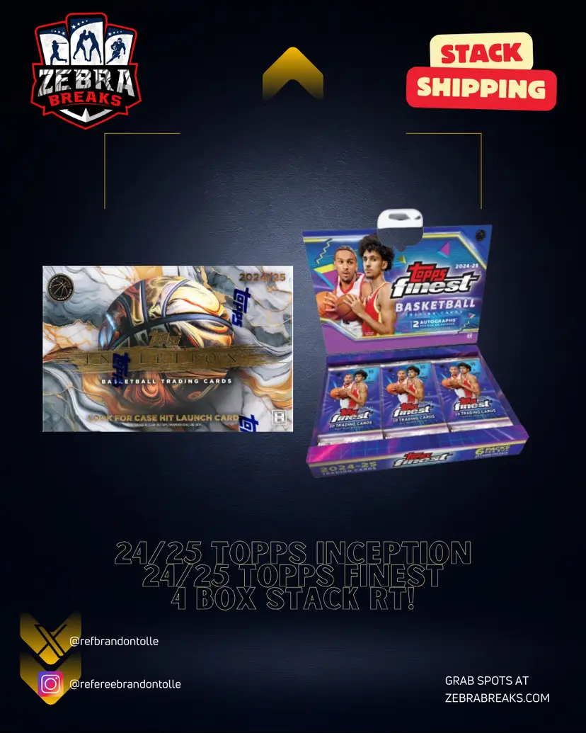 2 Boxes EACH of 24/25 Inception & Finest Basketball! STACK SHIPPING APPLIES All cards stack, you can request shipping by purchasing the "Stack Shipping Request" Item in the marketplace for Zebra Breaks specifically. Stack shipping is a $5 flat fee no matter how large your stack is. Shipping will occur the Friday/Saturday following your request if placed by Thursday night of the week you request shipping