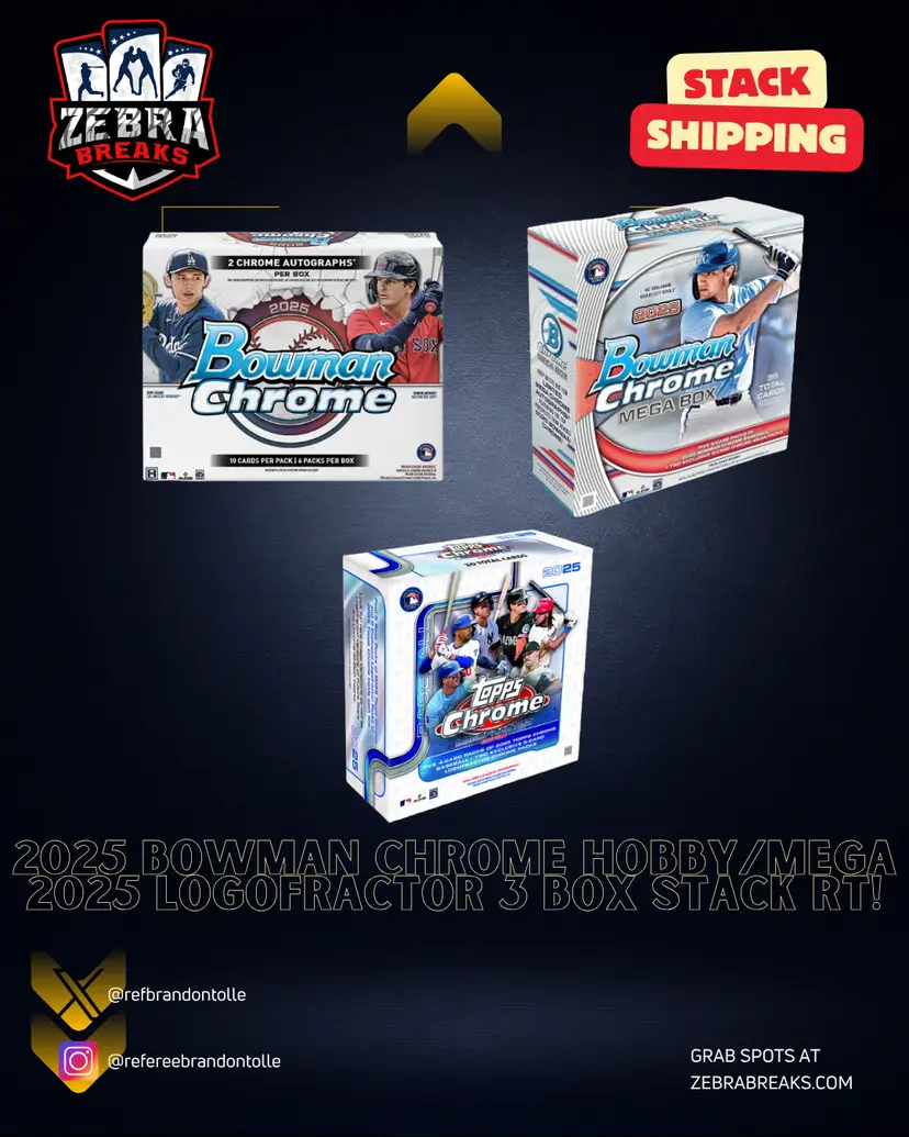 2025 Bowman Chrome Hobby/25 Bowman Chrome Mega/25 Topps Chrome Logofractor STACK SHIPPING APPLIES All cards stack, you can request shipping by purchasing the "Stack Shipping Request" Item in the marketplace for Zebra Breaks specifically. Stack shipping is a $6 flat fee no matter how large your stack is. Shipping will occur the Sunday/Monday following your request if placed by Thursday night of the week you request shipping.