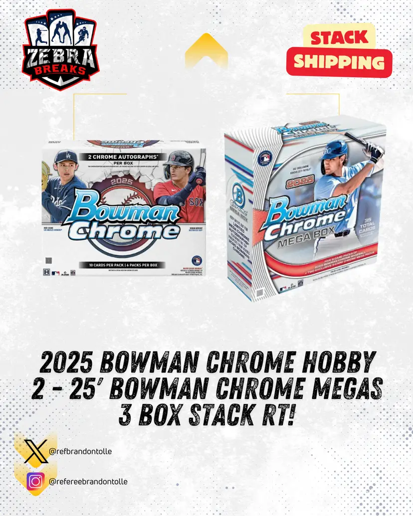 25 Bowman Chrome Hobby/2x 25 Bowman Chrome Mega *** STACK SHIPPING APPLIES*** All cards stack, you can request shipping by purchasing the "Stack Shipping Request" Item in the marketplace for Zebra Breaks specifically. Stack shipping is a $6 flat fee no matter how large your stack is. Shipping will occur the Sunday/Monday following your request if placed by Thursday night of the week you request shipping.