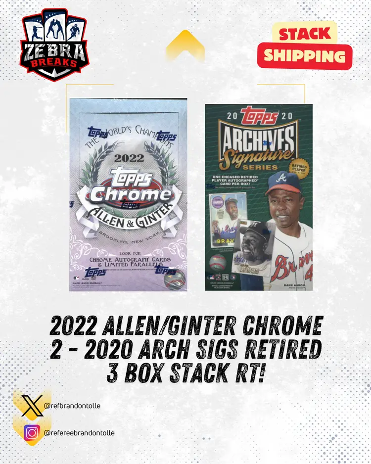 22 Allen & Ginter Chrome/2x 2020 Archive Signature Series Retired STACK SHIPPING APPLIES All cards stack, you can request shipping by purchasing the "Stack Shipping Request" Item in the marketplace for Zebra Breaks specifically. Stack shipping is a $6 flat fee no matter how large your stack is. Shipping will occur the Sunday/Monday following your request if placed by Thursday night of the week you request shipping.