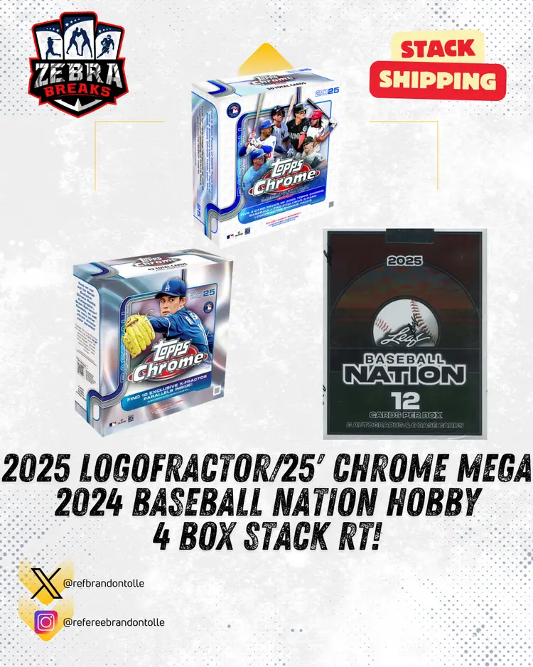 2x 25 Topps Chrome Logofractor/25 Topps Chrome Mega/24 Leaf Baseball Nation Hobby STACK SHIPPING APPLIES All cards stack, you can request shipping by purchasing the "Stack Shipping Request" Item in the marketplace for Zebra Breaks specifically. Stack shipping is a $6 flat fee no matter how large your stack is. Shipping will occur the Sunday/Monday following your request if placed by Thursday night of the week you request shipping.