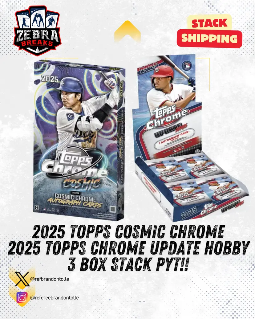 2 Boxes of 2025 Topps Cosmic Chrome & 1 Hobby Box of 2025 Topps Chrome Update Hobby! STACK SHIPPING APPLIES All cards stack, you can request shipping by purchasing the "Stack Shipping Request" Item in the marketplace for Zebra Breaks specifically. Stack shipping is a $6 flat fee no matter how large your stack is. Shipping will occur the Sunday/Monday following your request if placed by Thursday night of the week you request shipping.