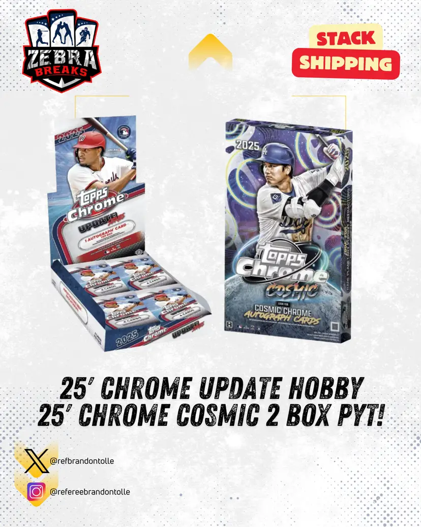 1 Hobby Box of BOTH 2025 Cosmic Chrome & Chrome Update Hobby STACK SHIPPING APPLIES All cards stack, you can request shipping by purchasing the "Stack Shipping Request" Item in the marketplace for Zebra Breaks specifically. Stack shipping is a $6 flat fee no matter how large your stack is. Shipping will occur the Sunday/Monday following your request if placed by Thursday night of the week you request shipping.