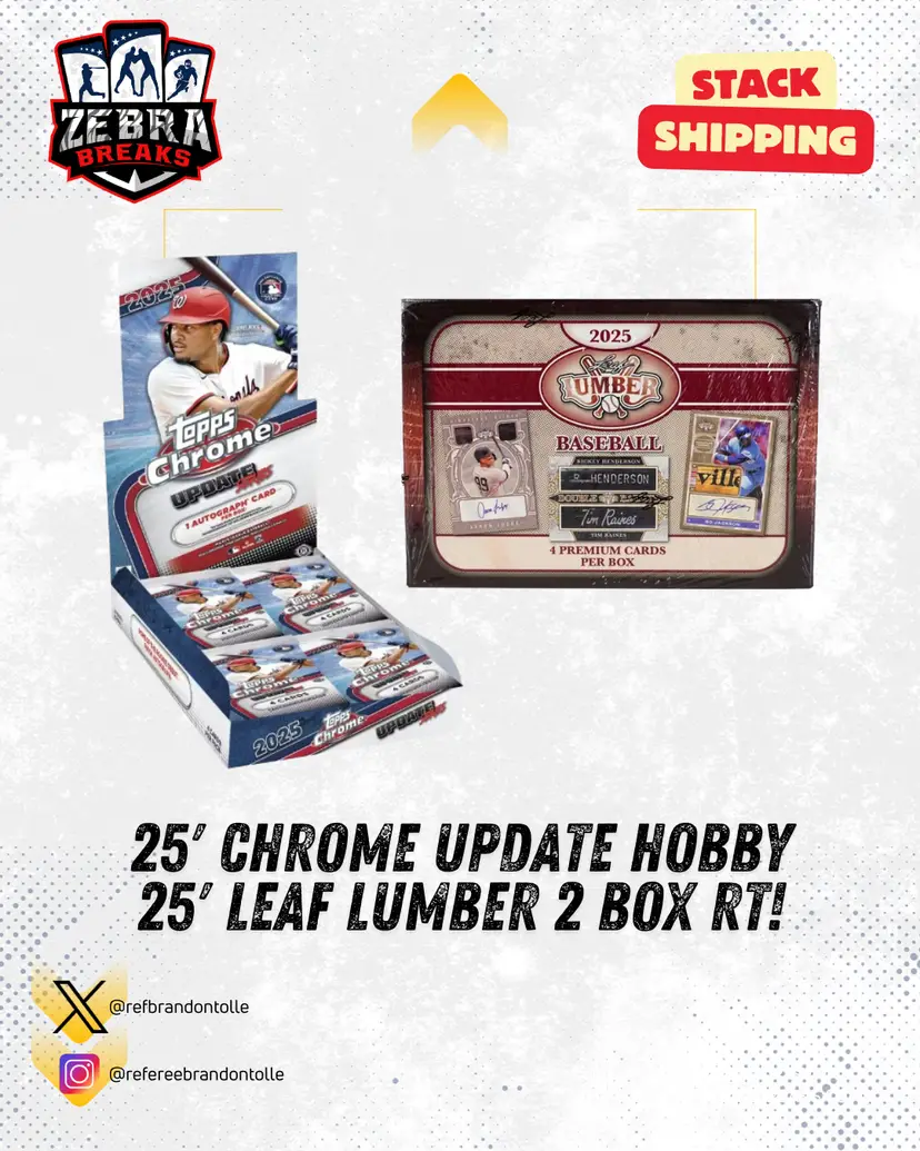 25 Topps Chrome Update Hobby/25 Leaf Lumber STACK SHIPPING APPLIES All cards stack, you can request shipping by purchasing the "Stack Shipping Request" Item in the marketplace for Zebra Breaks specifically. Stack shipping is a $6 flat fee no matter how large your stack is. Shipping will occur the Sunday/Monday following your request if placed by Thursday night of the week you request shipping.