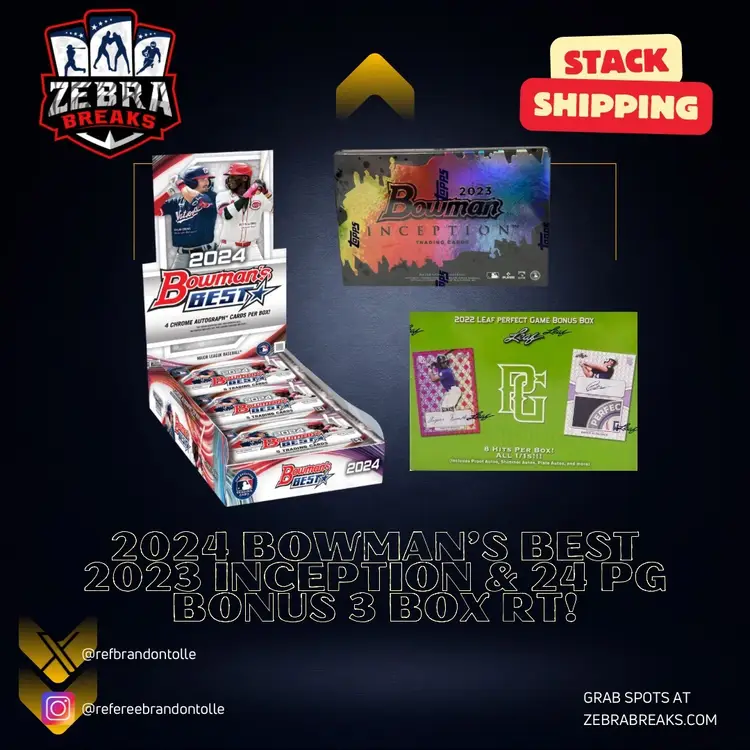 23 Bowman Inception/24 Leaf Perfect Game Bonus Box/24 Bowman's Best Hobby STACK SHIPPING APPLIES All cards stack, you can request shipping by purchasing the "Stack Shipping Request" Item in the marketplace for Zebra Breaks specifically. Stack shipping is a $5 flat fee no matter how large your stack is. Shipping will occur the Friday/Saturday following your request if placed by Thursday night of the week you request