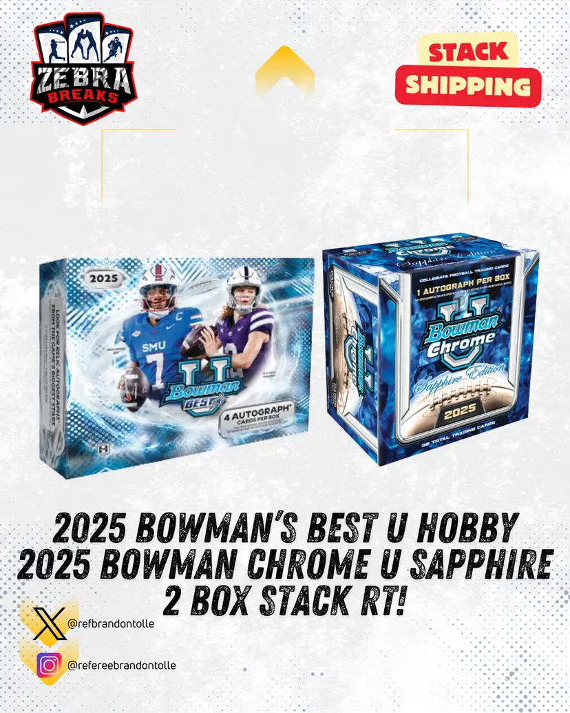 STACK SHIPPING APPLIES All cards stack, you can request shipping by purchasing the "Stack Shipping Request" Item in the marketplace for Zebra Breaks specifically. Stack shipping is a $6 flat fee no matter how large your stack is. Shipping will occur the Sunday/Monday following your request if placed by Thursday night of the week you request shipping.