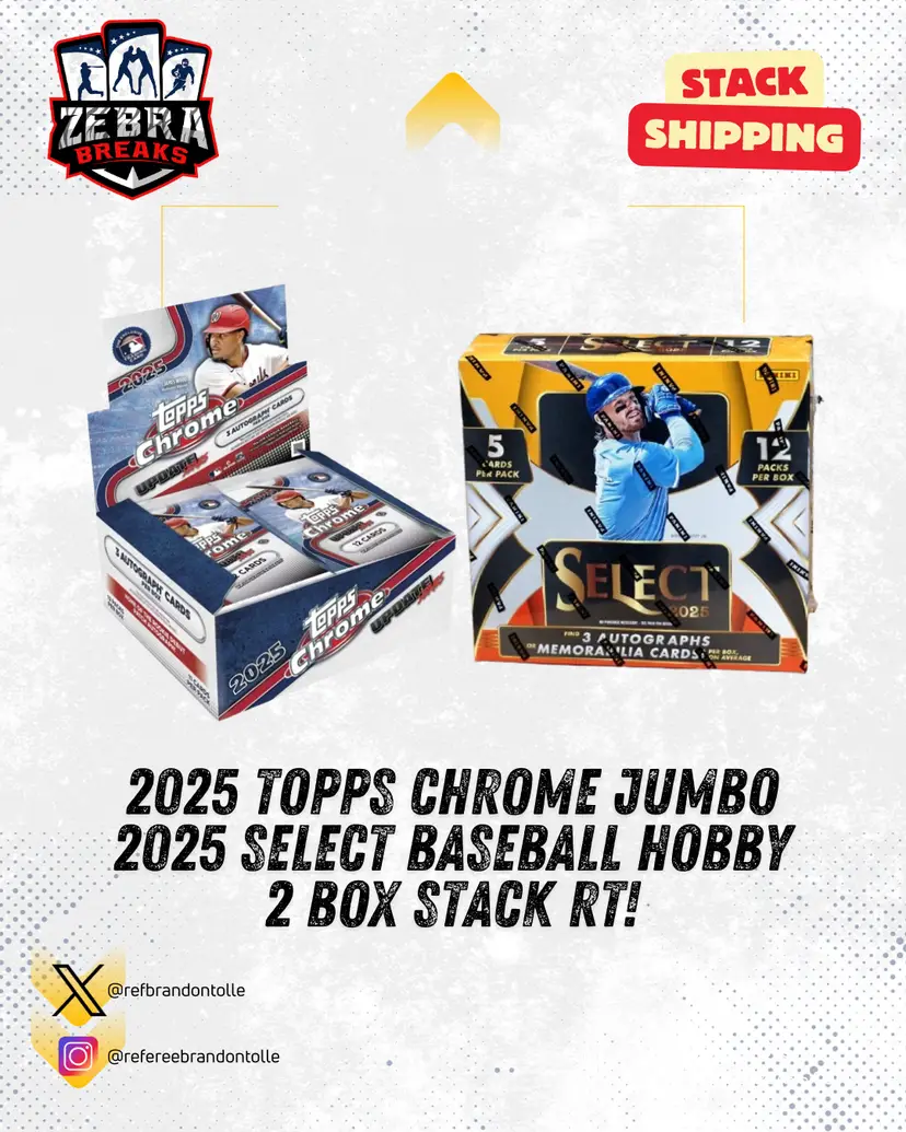 2025 Topps Chrome Update Jumbo/2025 Select Hobby STACK SHIPPING APPLIES All cards stack, you can request shipping by purchasing the "Stack Shipping Request" Item in the marketplace for Zebra Breaks specifically. Stack shipping is a $6 flat fee no matter how large your stack is. Shipping will occur the Sunday/Monday following your request if placed by Thursday night of the week you request shipping.