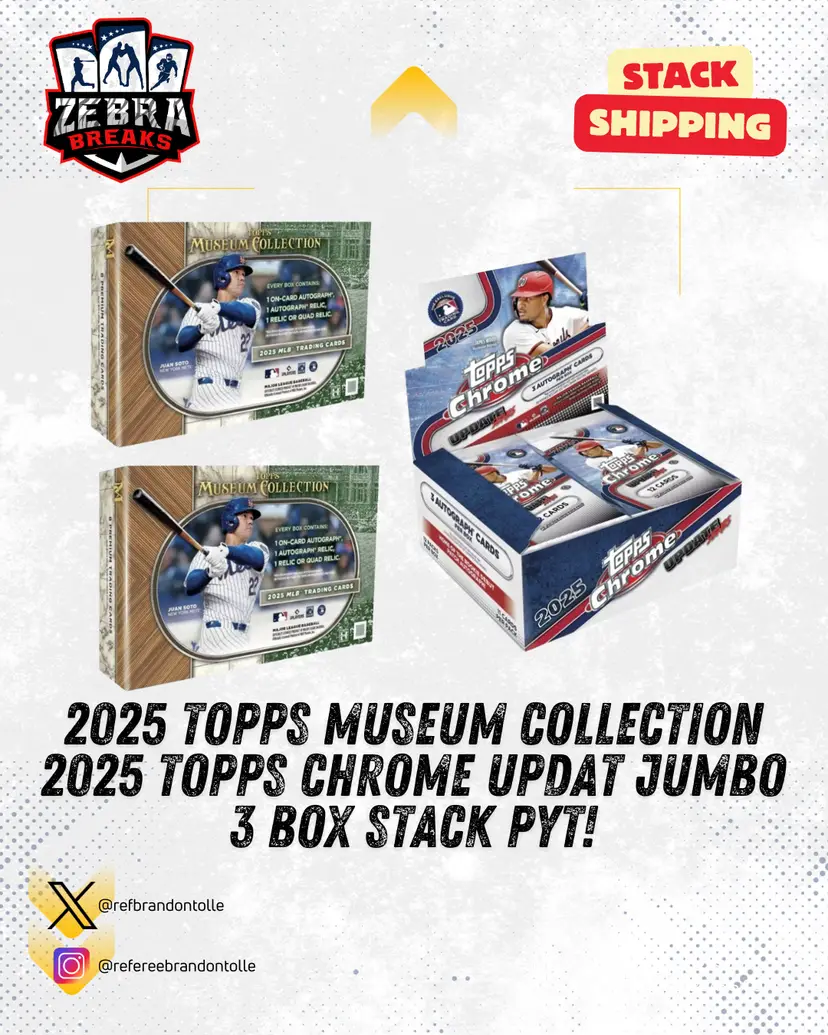 2 Boxes of 2025 Museum Collection/1 Jumbo of 2025 Chrome Update Jumbo STACK SHIPPING APPLIES All cards stack, you can request shipping by purchasing the "Stack Shipping Request" Item in the marketplace for Zebra Breaks specifically. Stack shipping is a $6 flat fee no matter how large your stack is. Shipping will occur the Sunday/Monday following your request if placed by Thursday night of the week you request shipping.