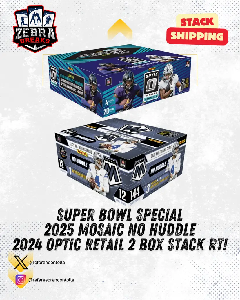 "Super Bowl Special" 2025 Mosaic No Huddle/2024 Optic Retail Box STACK SHIPPING APPLIES All cards stack, you can request shipping by purchasing the "Stack Shipping Request" Item in the marketplace for Zebra Breaks specifically. Stack shipping is a $6 flat fee no matter how large your stack is. Shipping will occur the Sunday/Monday following your request if placed by Thursday night of the week you request shipping.
