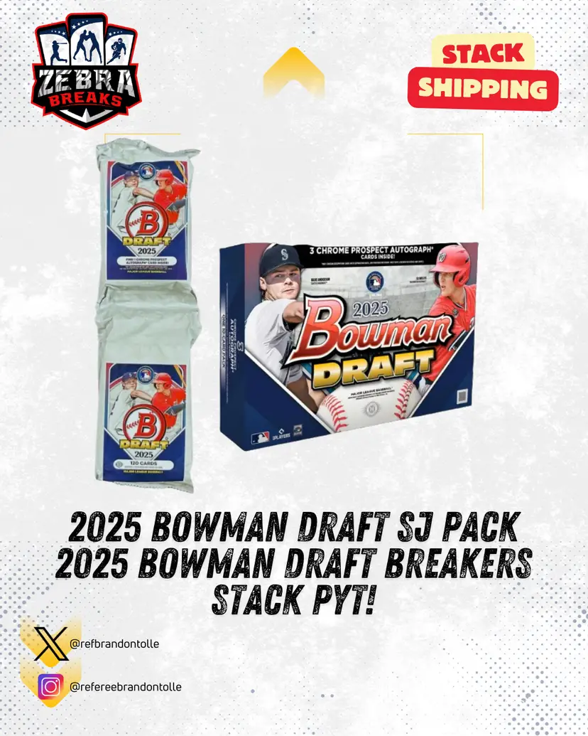 25 Bowman Draft Super Jumbo Pack/25 Bowman Draft Breakers Delight STACK SHIPPING APPLIES All cards stack, you can request shipping by purchasing the "Stack Shipping Request" Item in the marketplace for Zebra Breaks specifically. Stack shipping is a $6 flat fee no matter how large your stack is. Shipping will occur the Sunday/Monday following your request if placed by Thursday night of the week you request shipping.