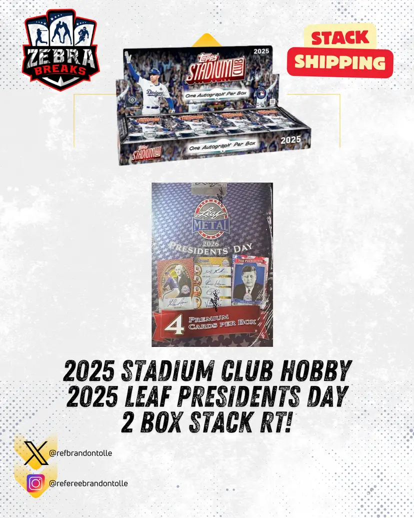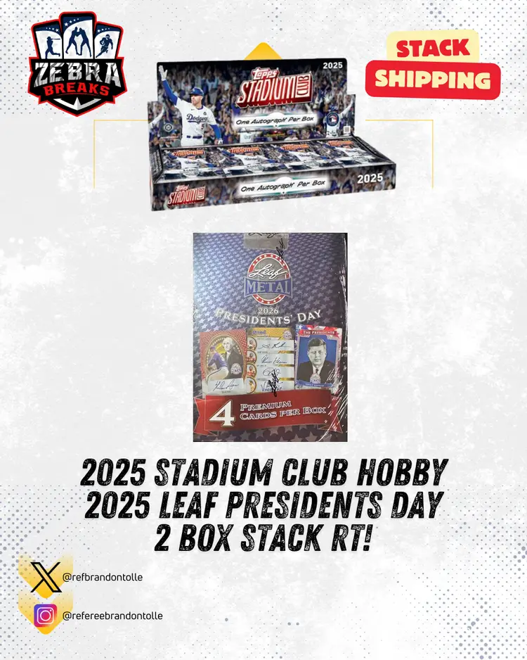 STACK SHIPPING APPLIES All cards stack, you can request shipping by purchasing the "Stack Shipping Request" Item in the marketplace for Zebra Breaks specifically. Stack shipping is a $6 flat fee no matter how large your stack is. Shipping will occur the Sunday/Monday following your request if placed by Thursday night of the week you request shipping.