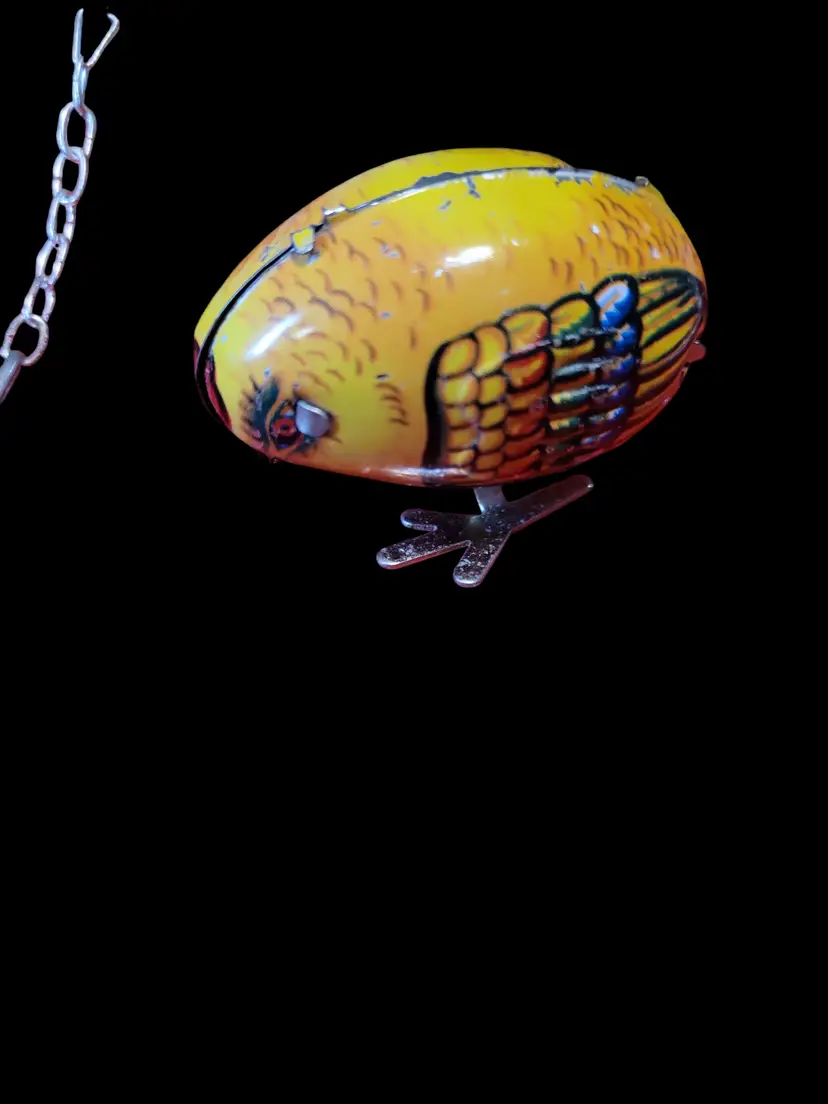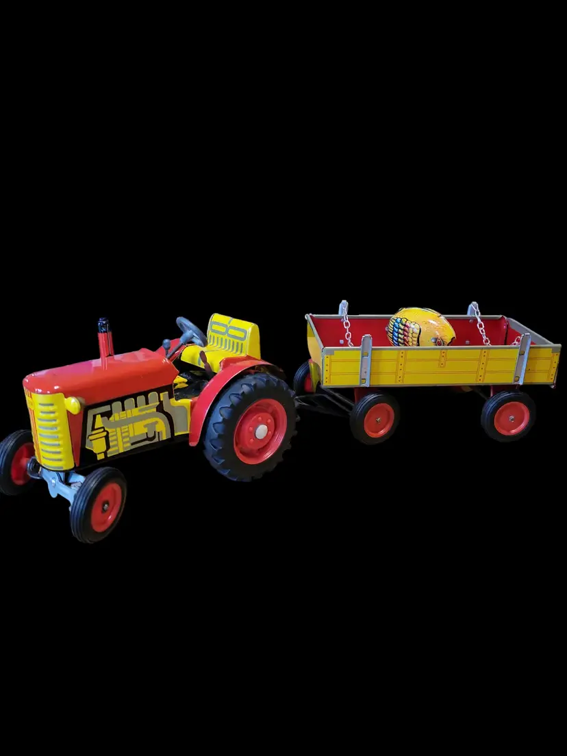 Tin vtg wind up Tractor, trailer and chicken ( no key) Measures Tractor 6x4" Trailer 8 x 3" Chicken 2.5 x 2" Key can be ordered, standard size.