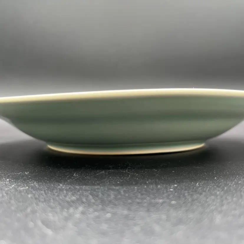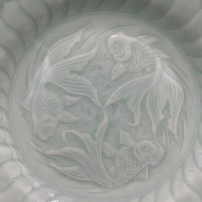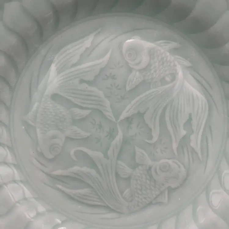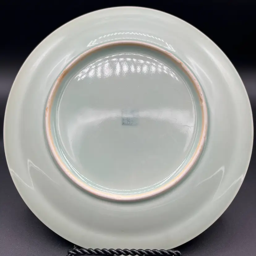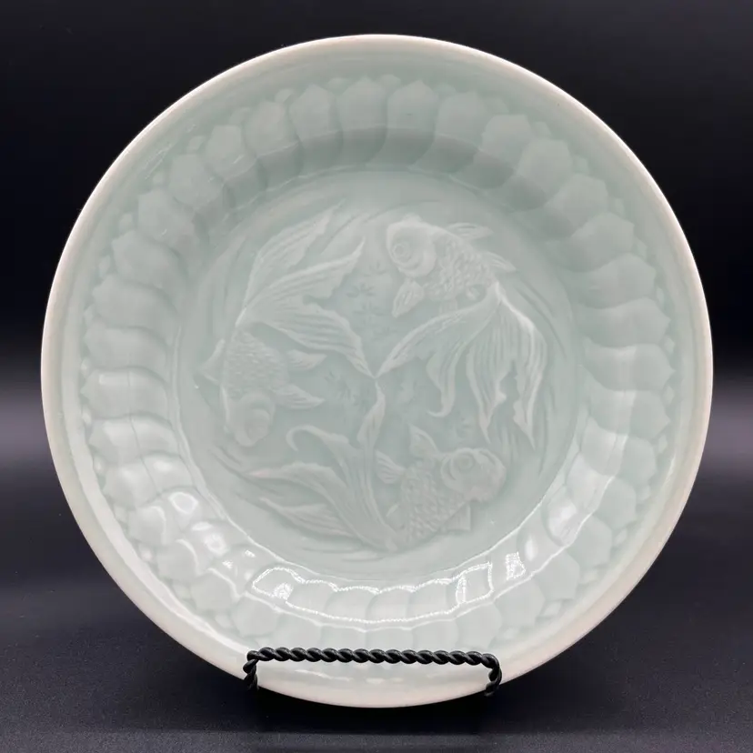 9" plate with green Celadon glaze and three Koi. This is Modern Ware from the late 20th Century, referred to as Zhongguo Longquan (China Longquan). It is pre-owned and in excellent condition.