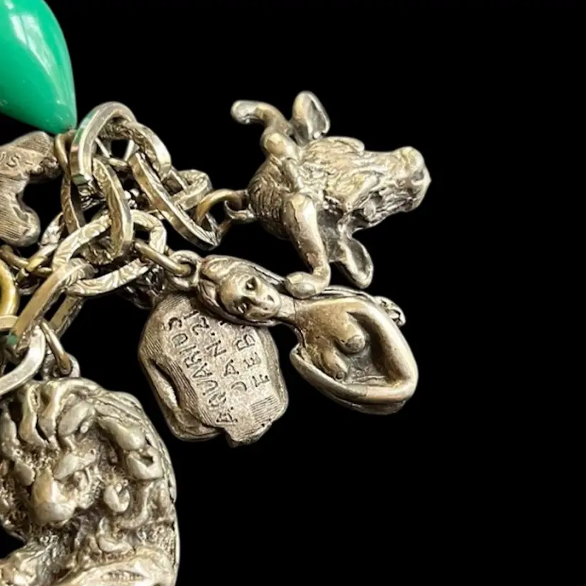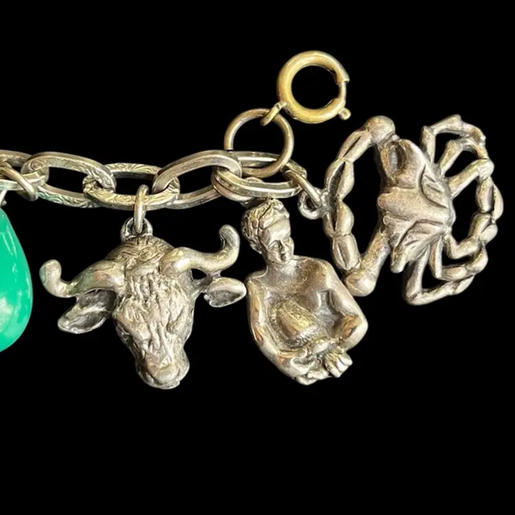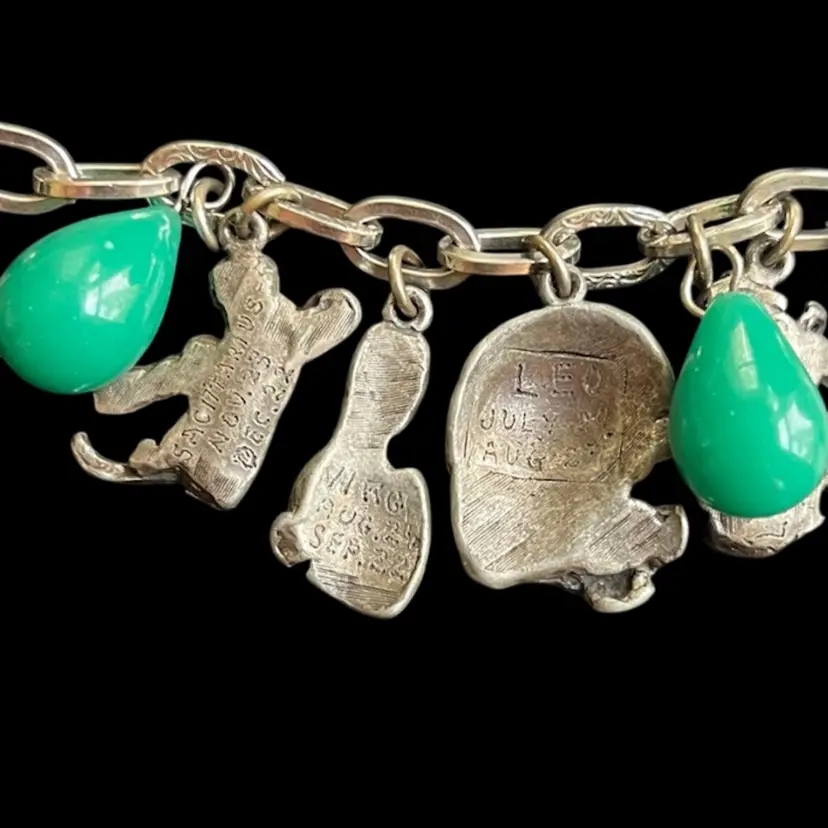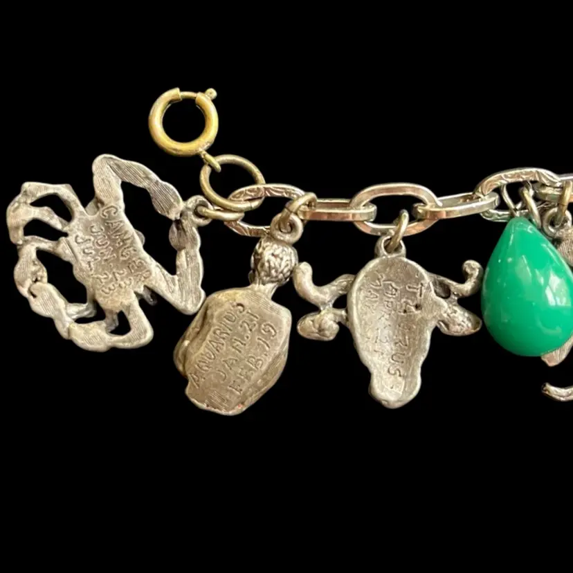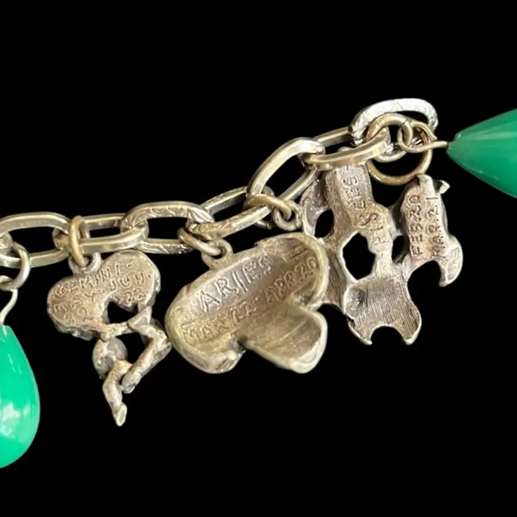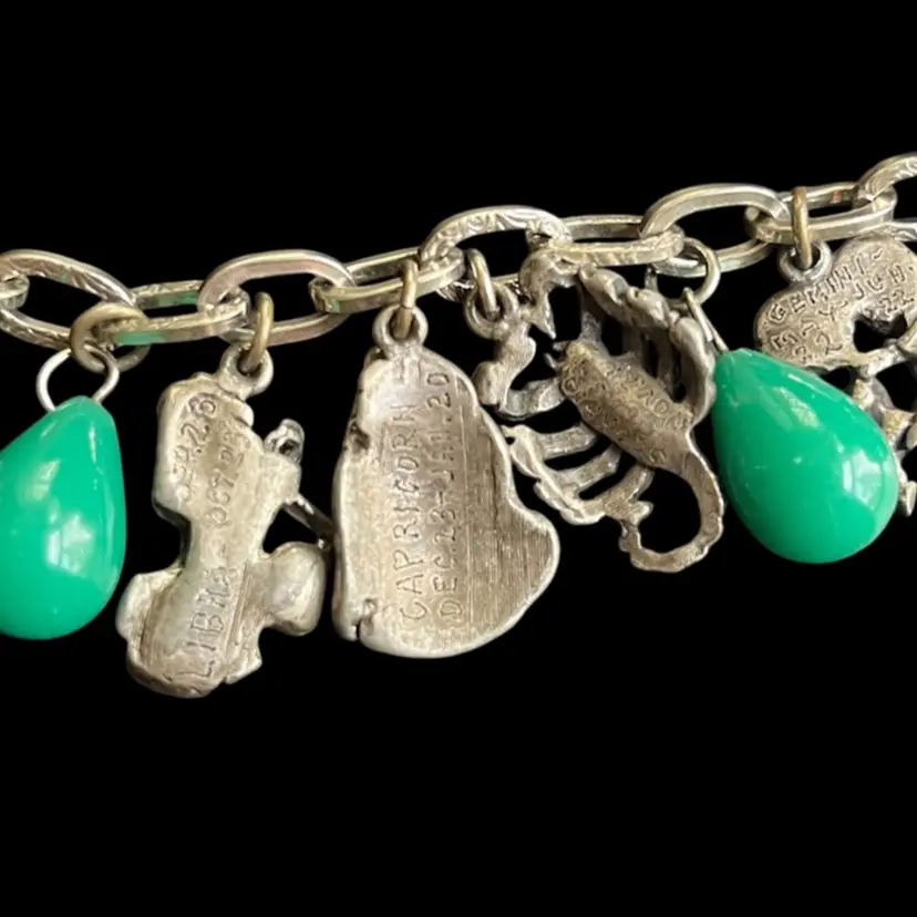 Approximately 7.25” long. The charms are heavy, silver tone, cast metal representing the signs of the Zodiac, each with the name and dates for its astrological sign engraved on the back. The charms appear to have some sort of plating on them that is worn in places on some charms (example in second to last photo). There are four green glass drop charm accents. Some of the glass charms have wear (see last photo), like tiny chips where the tail of the drop meets the metal hardware. The clasp has perhaps been replaced and is more of a brass color.