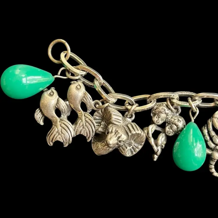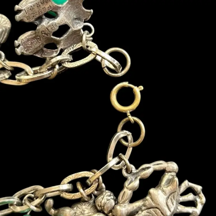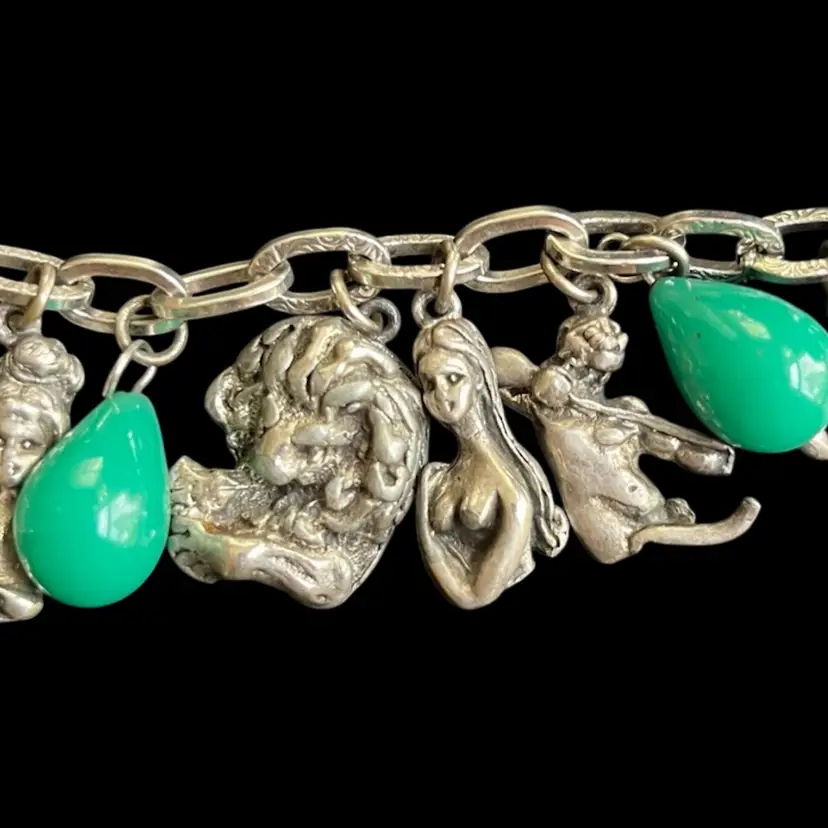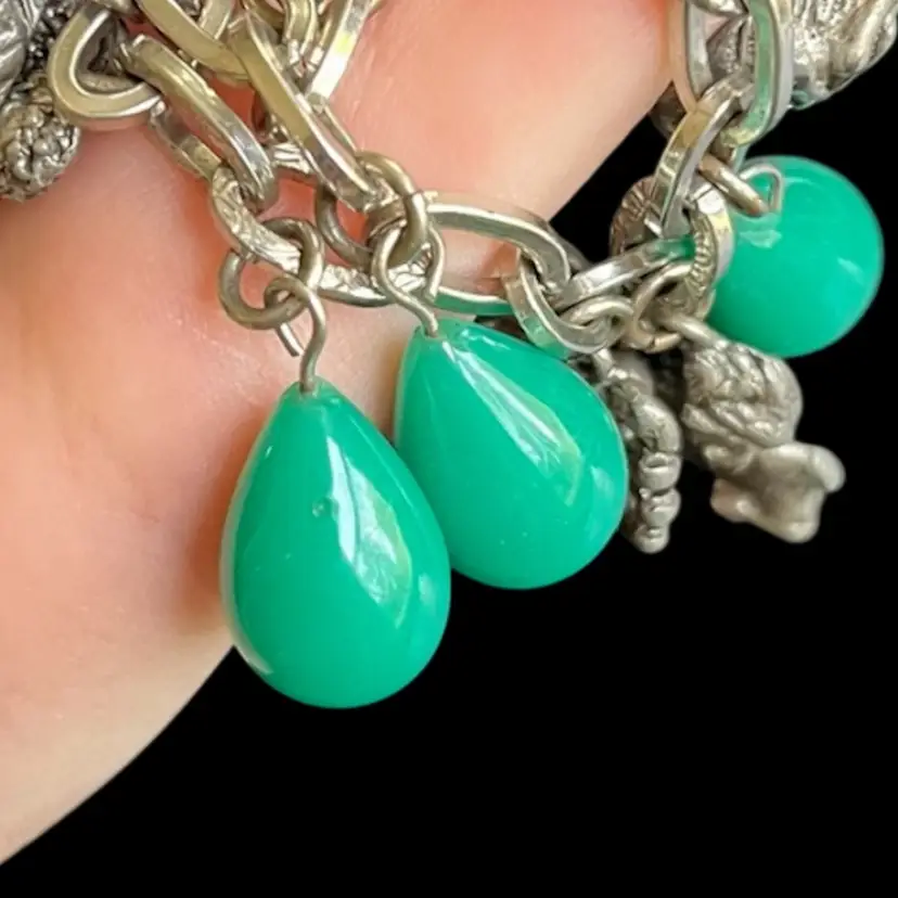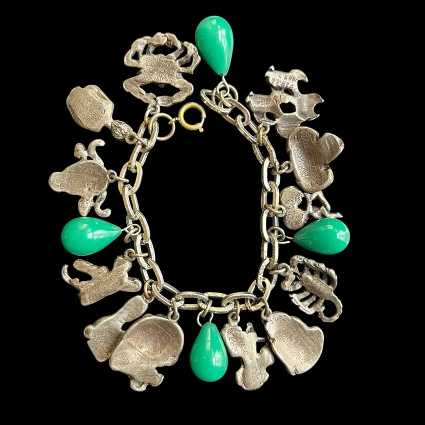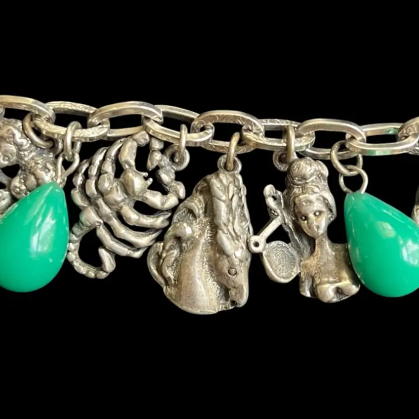 Approximately 7.25” long. The charms are heavy, silver tone, cast metal representing the signs of the Zodiac, each with the name and dates for its astrological sign engraved on the back. The charms appear to have some sort of plating on them that is worn in places on some charms (example in second to last photo). There are four green glass drop charm accents. Some of the glass charms have wear (see last photo), like tiny chips where the tail of the drop meets the metal hardware. The clasp has perhaps been replaced and is more of a brass color.