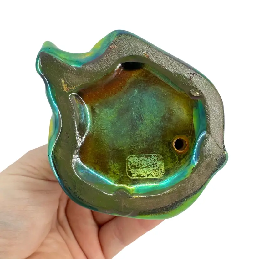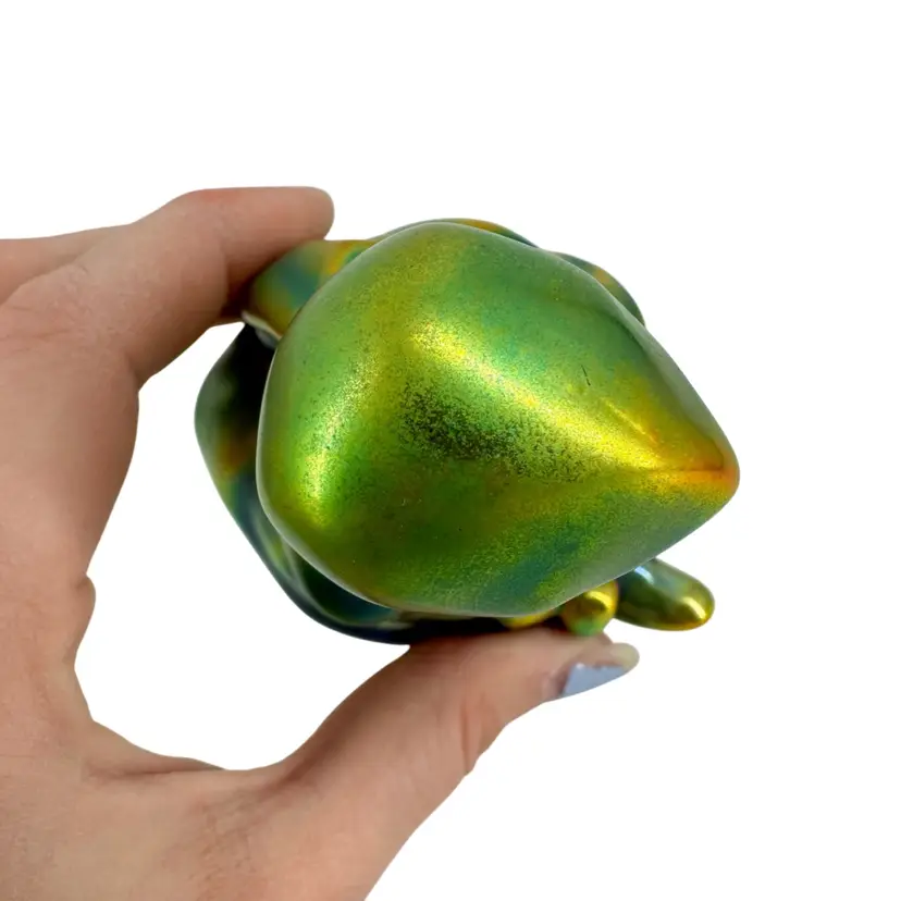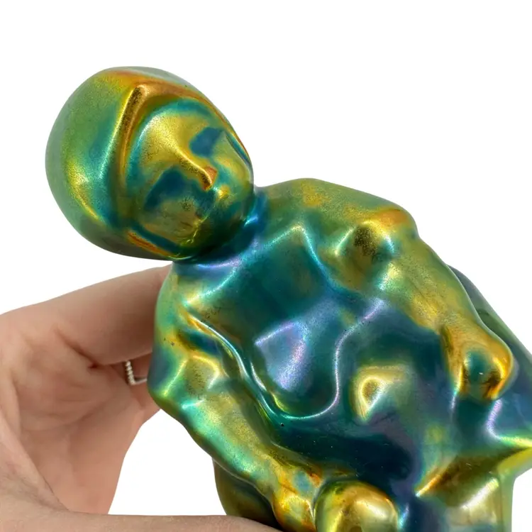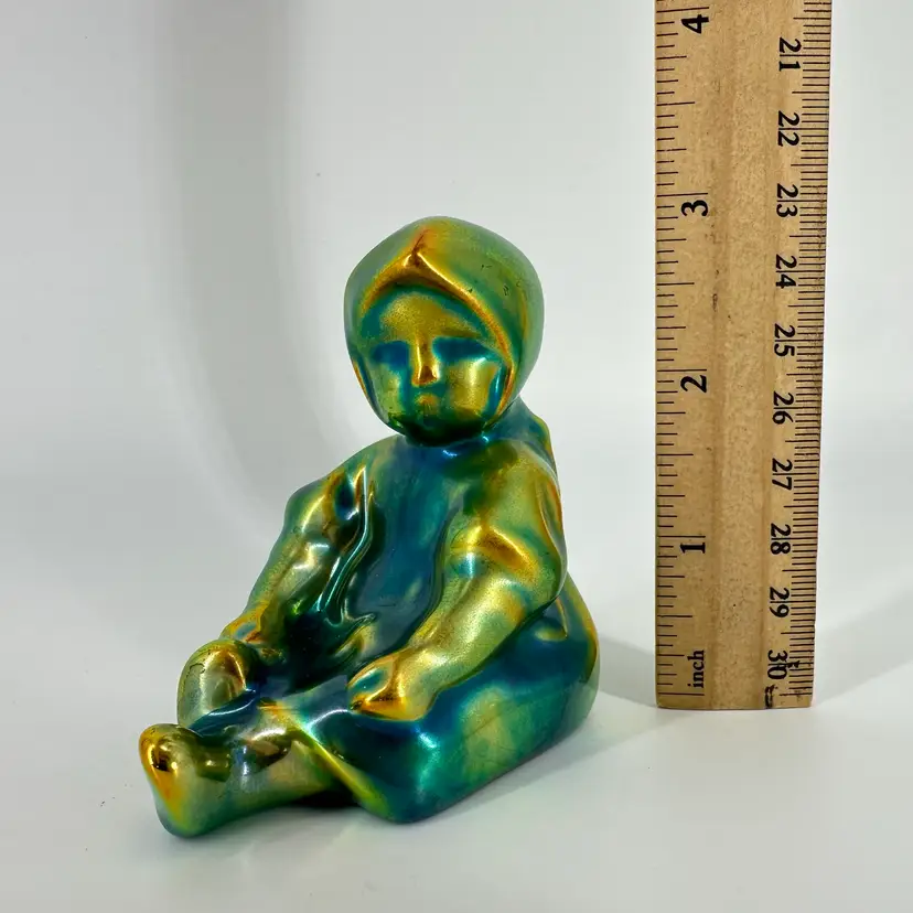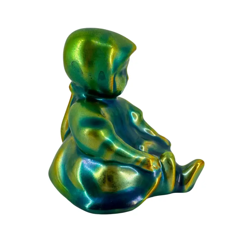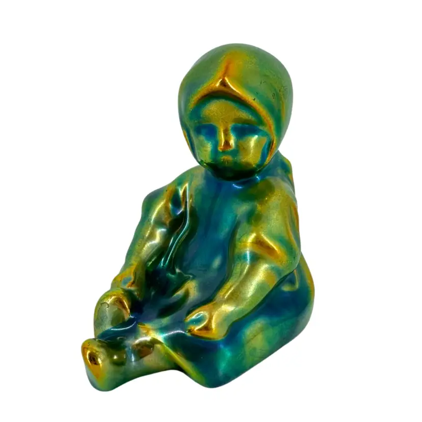 Small figurine of a sitting young girl in her bonnet and dress made by Zsolney in Hungary. Features a bright iridescent green brown and blue finish. Measures approximately 3” tall by 2.5” wide. No chips or cracks. Some “flea bites” in iridescent finish as can be seen in pictures. A faded marking can be seen on bottom “ZSOLNEY HUNGARY”