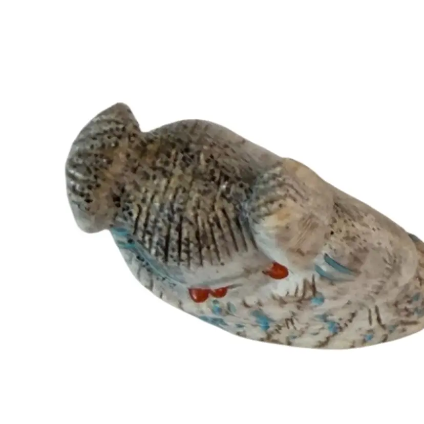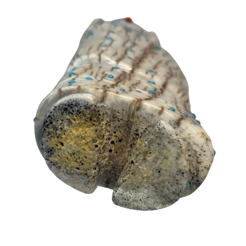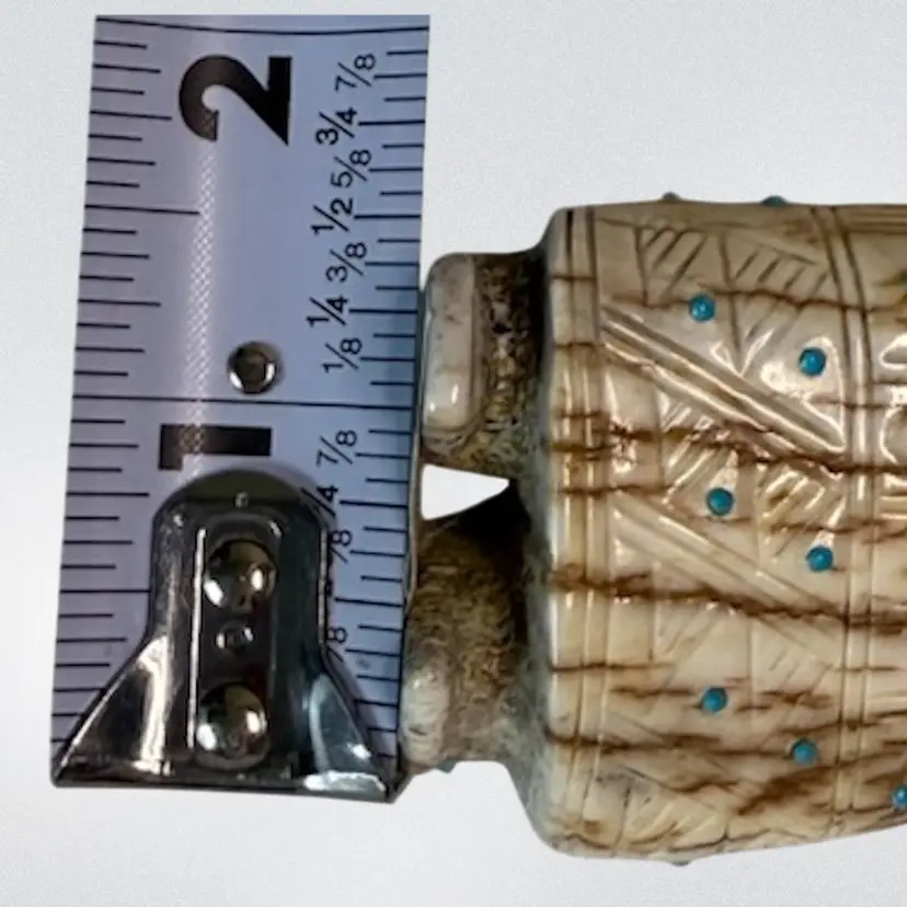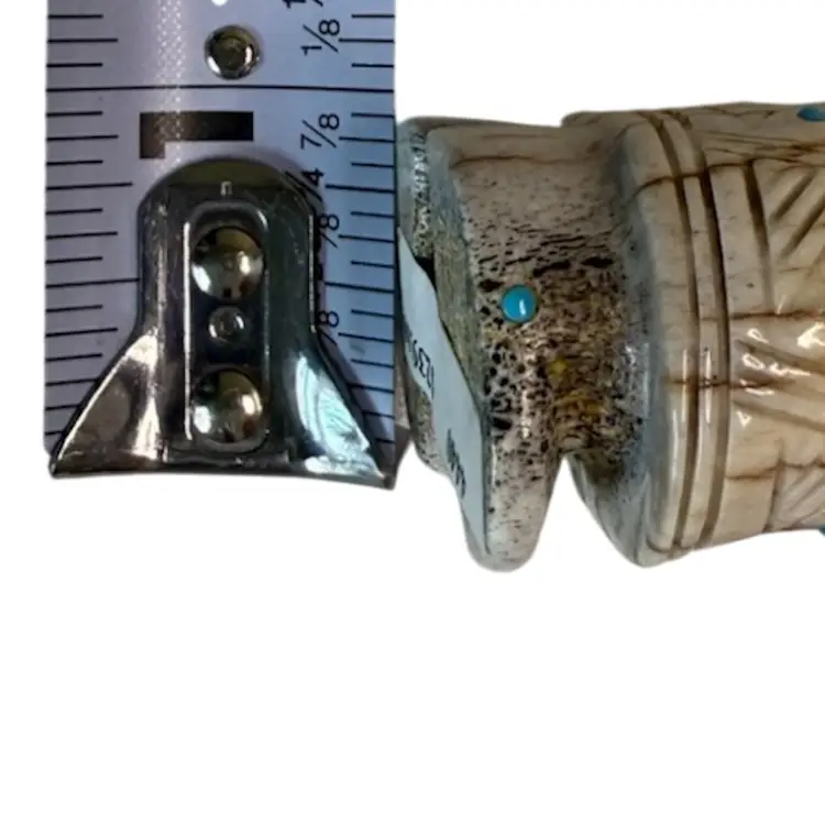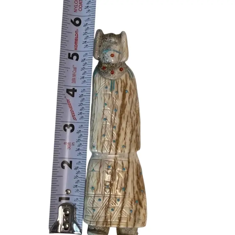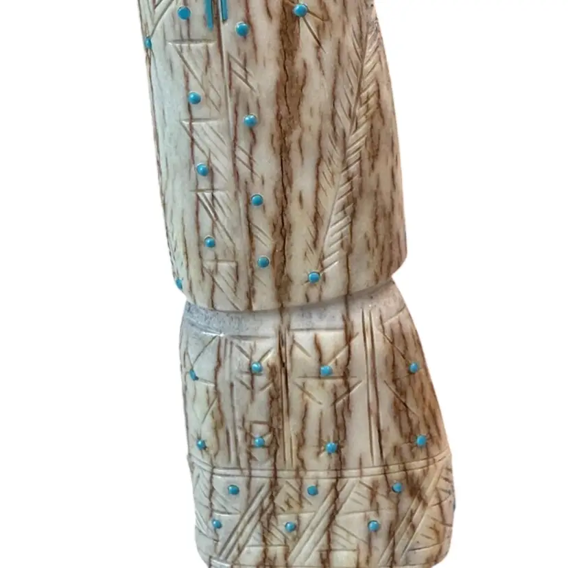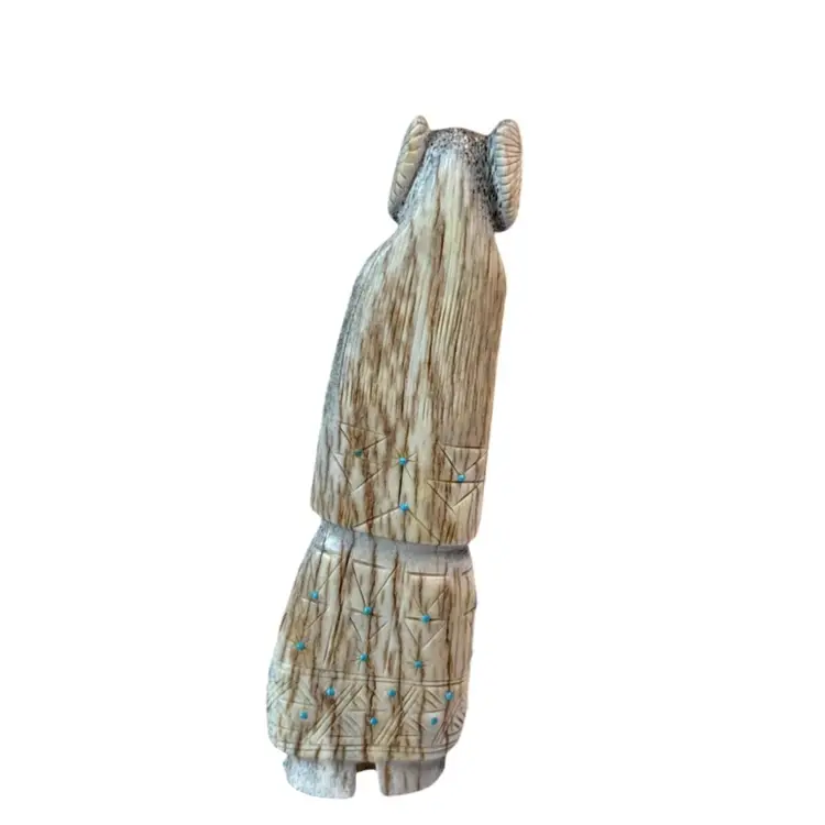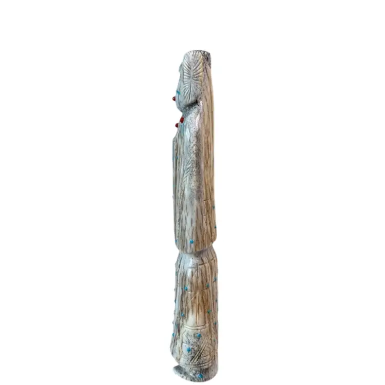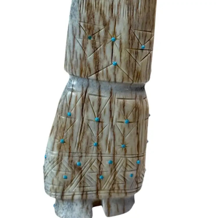 Carved from deer antler, this impressive figurine depicts a corn maiden. The maiden features various turquoise accents with fine lines and triangles etched along her dress possibly by artist Claudia Peina? The corn maiden is considered a bringer of life and represents potential.