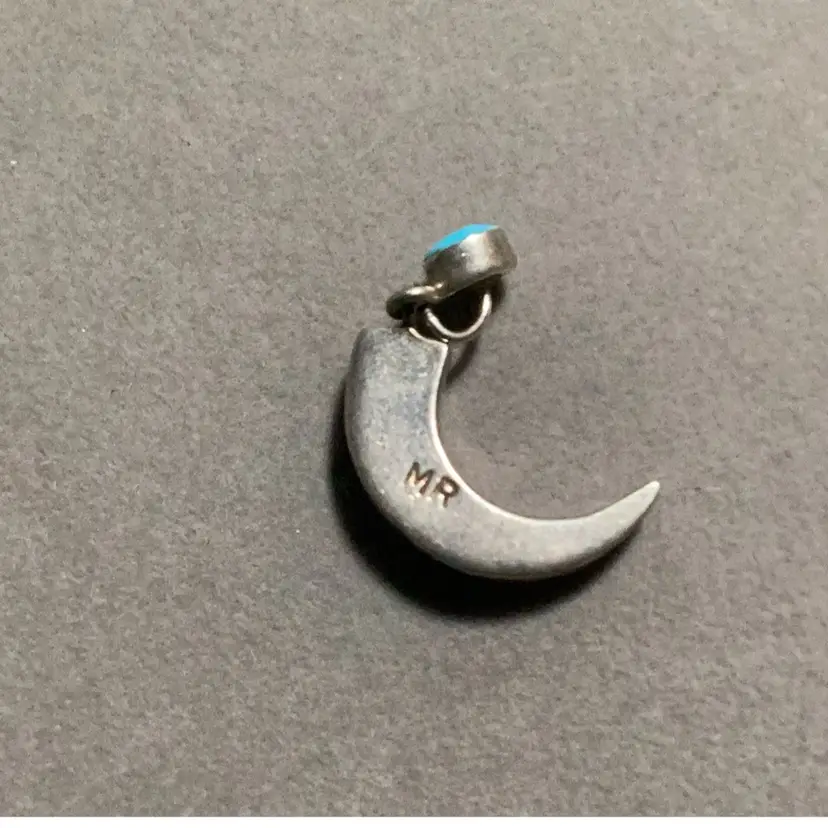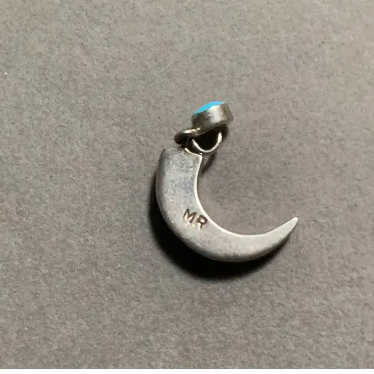 Vintage Zuni sterling silver crescent moon pendant,needlepoint inlays of turquoise stone,jet,shell and coral,the Zuni renowned for intricate craftsman and precise inlay work.