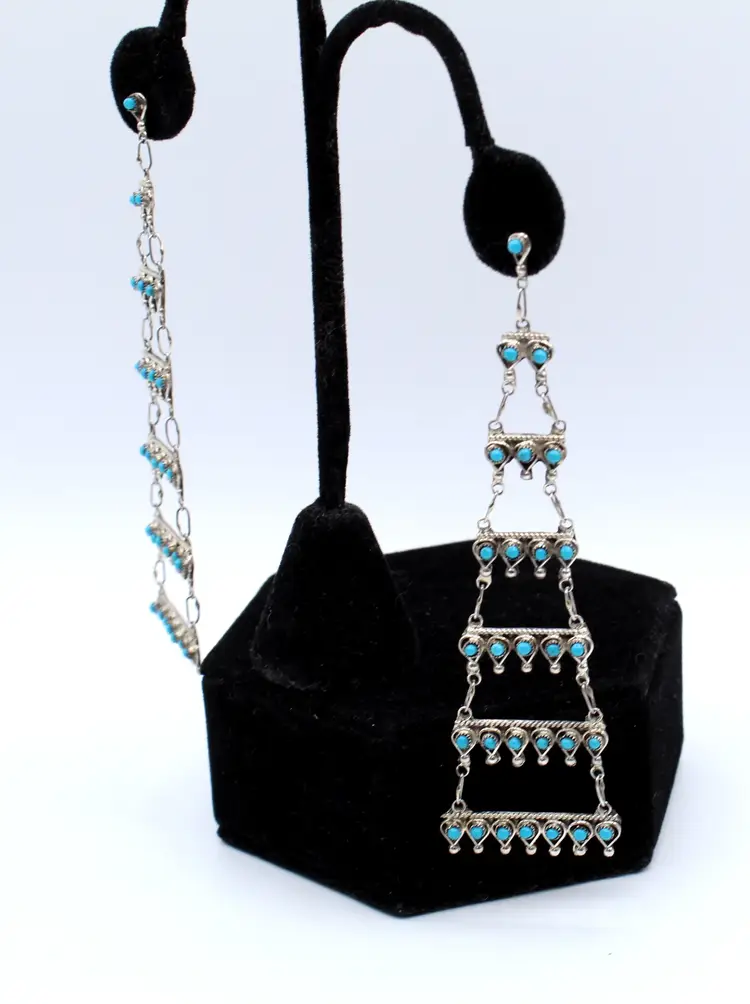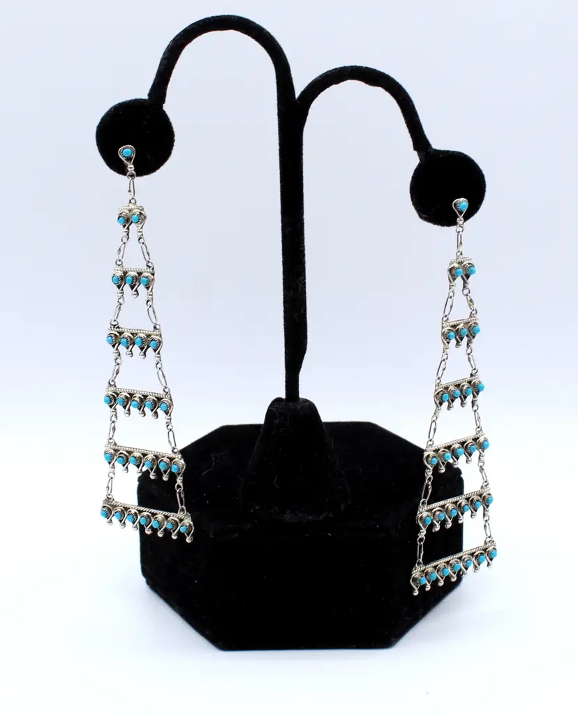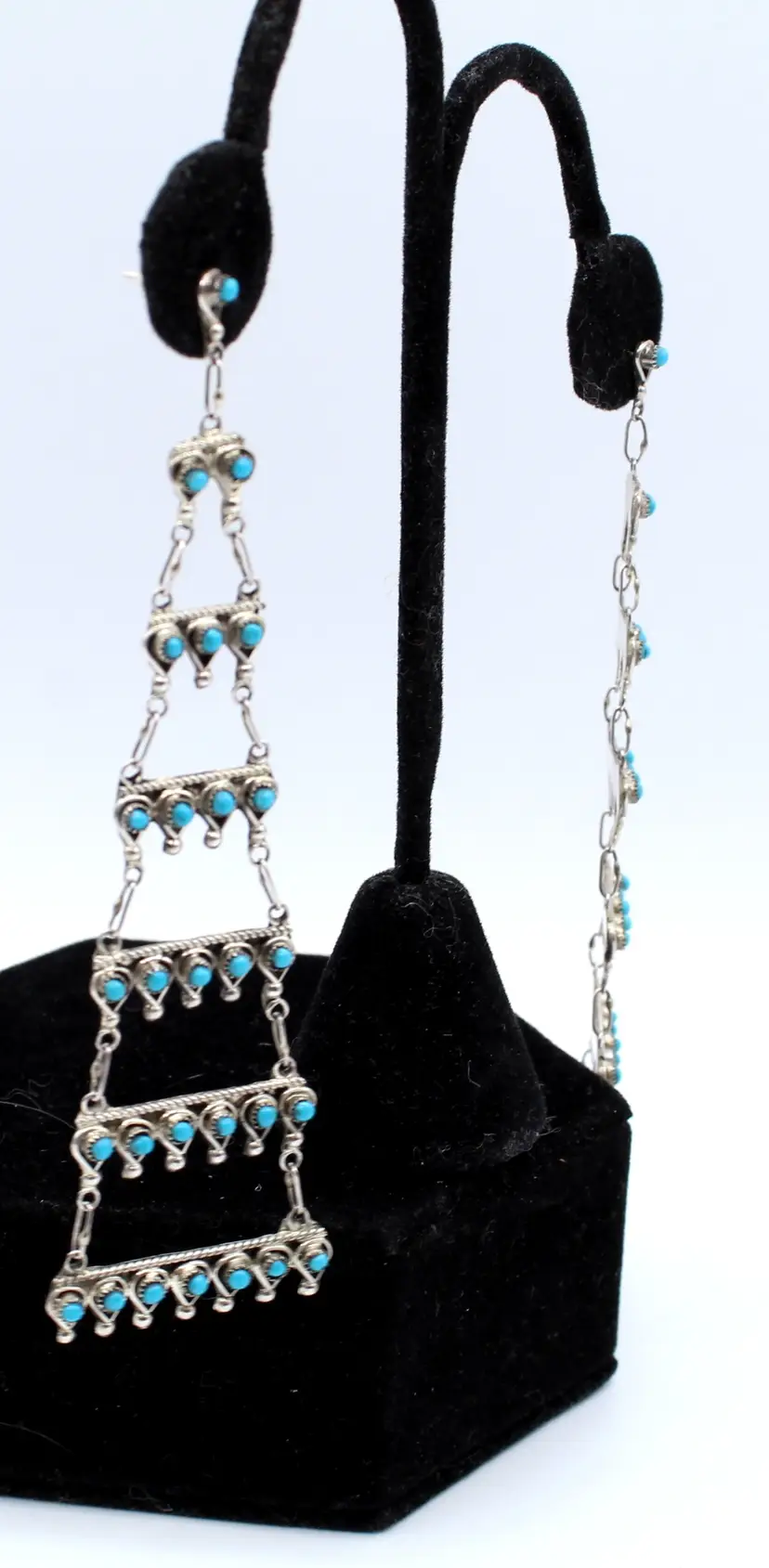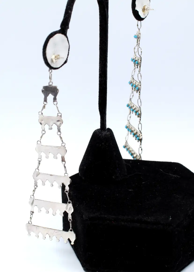 Amazing unknown artist signed WF in scratch. Fantastic super long 4.25" long dangle earrings. Six rows of stones set in saw tooth bezels and dribbled with dots.