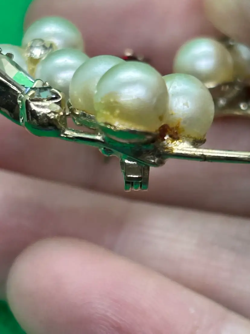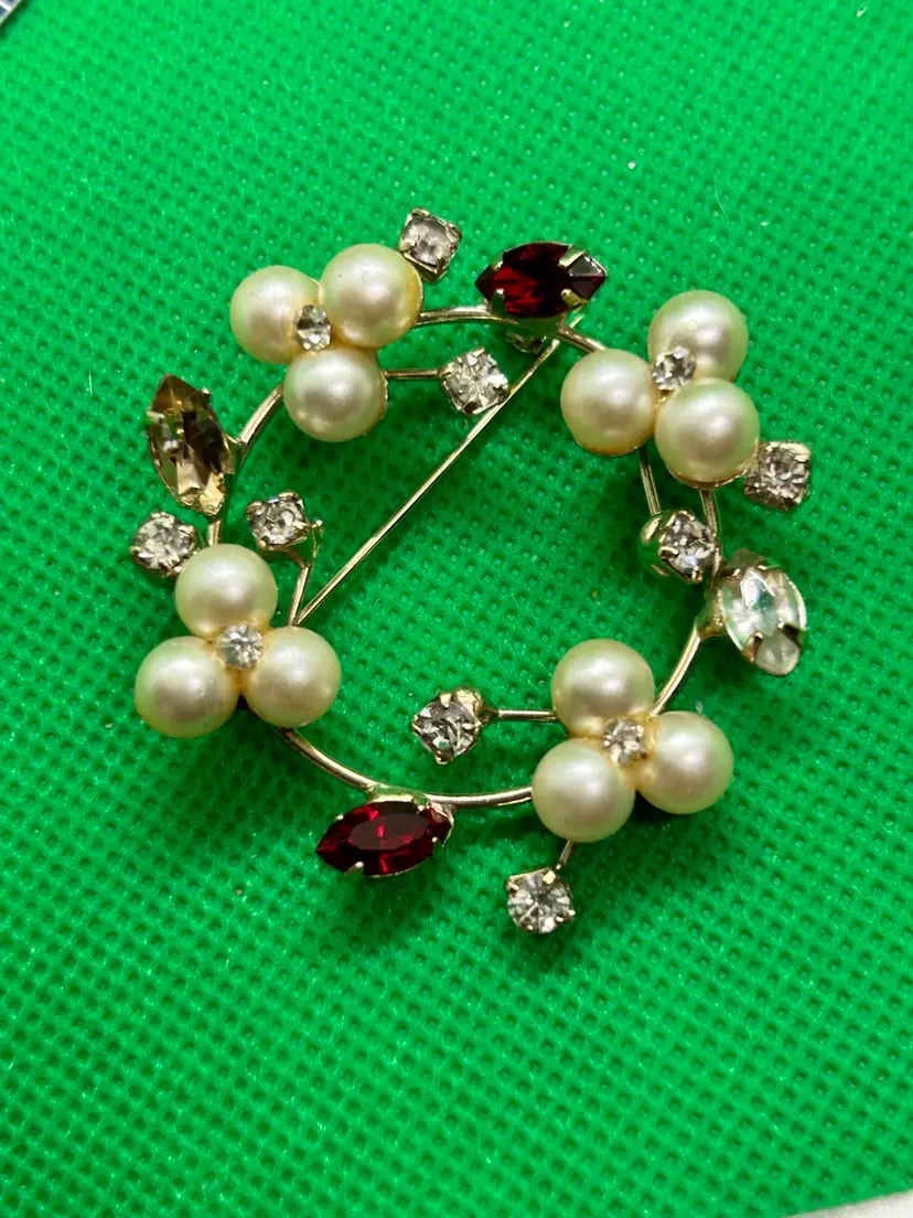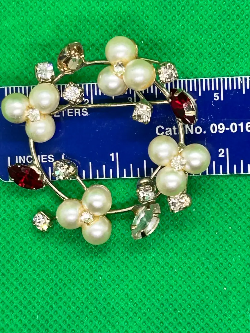 ATTENTION: this brooch has been repaired in the past and again my me I replaced a missing marquise rhinestone with a clear marquise rhinestone in the 5 o’clock position of the wreath. It doesn’t match the light amber color marquise rhinestone that is straight across. There is also some exposed old glue on just one of the trio pearls from a possible past repair. Please see photos as they are part of the description. Thank you for looking at this marvelous brooch!