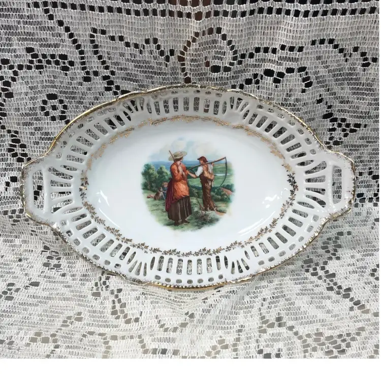 Vintage German Reticulated Porcelain Bread Basket Bowl With Transferware Family Farm Scene