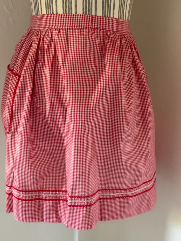 Vintage Red Gingham Apron with Rick Rack Detailed Pocket Embroidered 55" x 17"