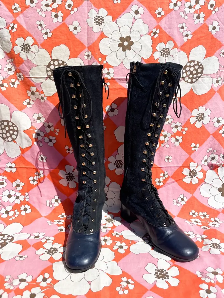 🌼 GROOVIEST Vintage 1960's Blue Suede Lace Up Go-Go Boots 🦋