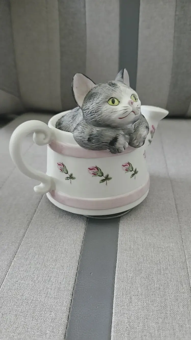 Vintage Mann Rotating Music Box Cat in Watering Can Kitten Japan 1982 Porcelain WORKS