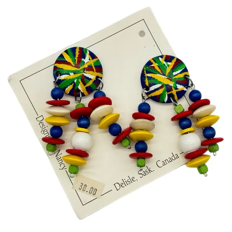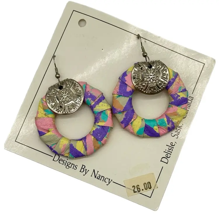 Vintage 1980’s Hand Made Earrings Leather Metal Wood Mixed Material Retro OOAK