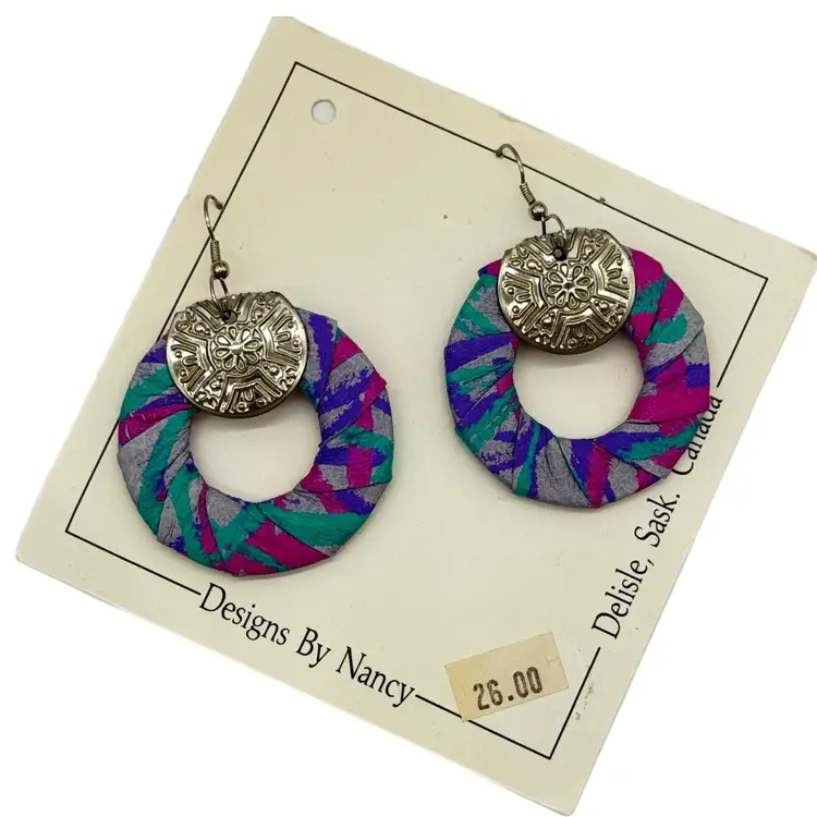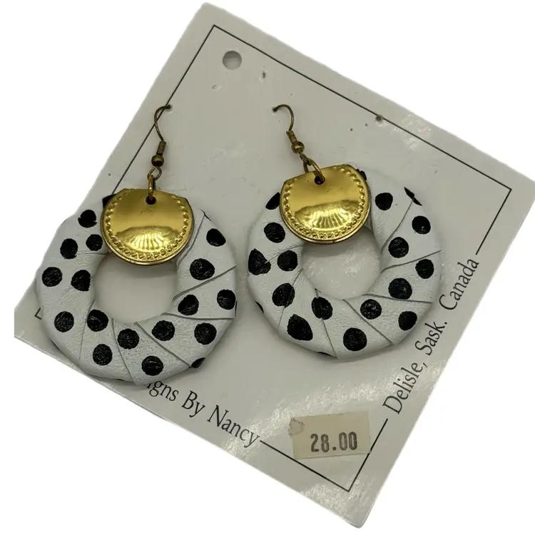 Vintage 1980’s Hand Made Dangle Earrings Leather Metal Mixed Material Retro OOAK