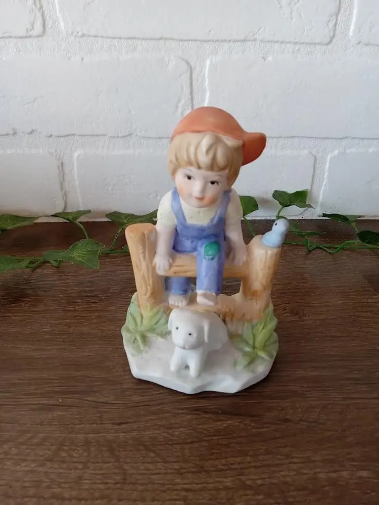Vintage Darling Statue of Boy Climbing Fence with Dog Figurine