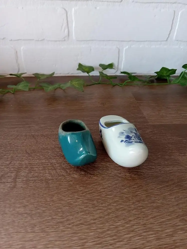 Set of 2 Blue Miniature Dutch Shoes Clogs One is Enesco, one is Unmarked and Art Pottery