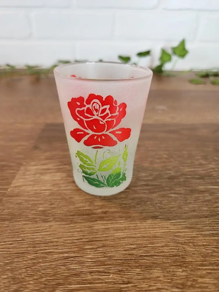 1950 Frosted Juice Glass Red Roses Green Vines Candle Holder Planter