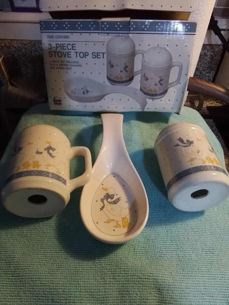 Vintage Goose With Blue Bow S&P Plus Spoon Rest Made In Japan