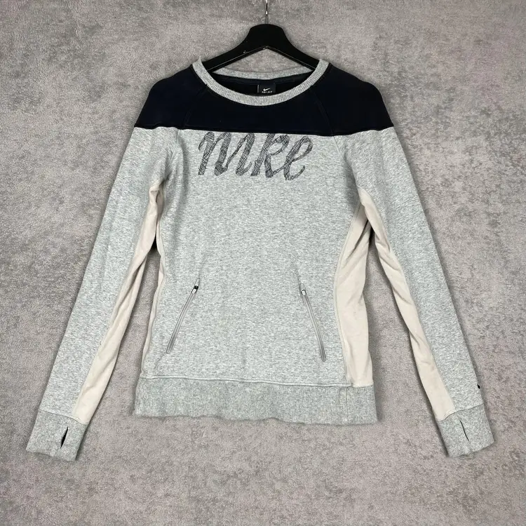 Nike Sweatshirt Womens Small Gray Navy Dri-FIT Thumbholes Zip Pockets Pullover J-3531