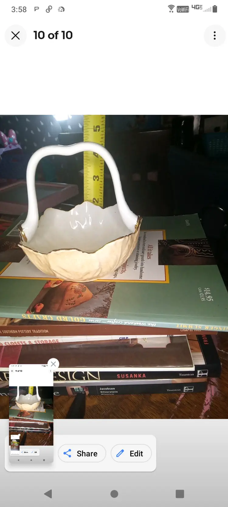 Porcelain Hand painted Flower Bowl With Handle Dated And Signed 1984 Wendy Ross