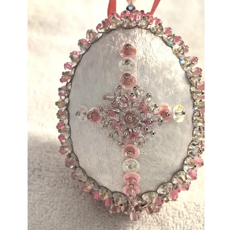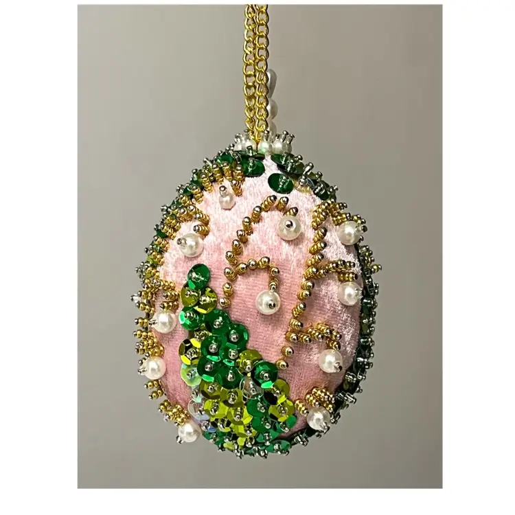Handmade Vintage Style Push Pin Easter Egg Ornament Pearls Beads Sequins Ribbon 3.5 in Height