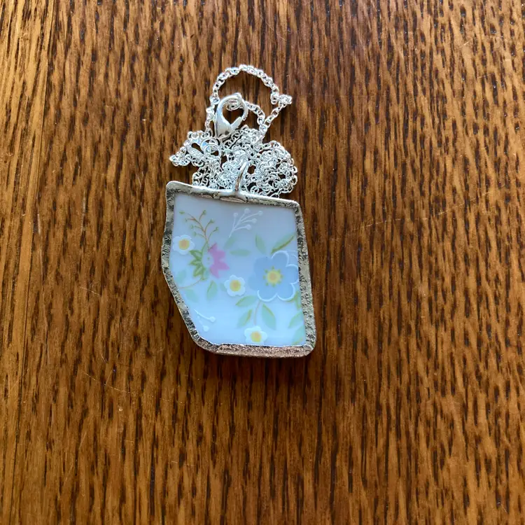 Broken Pottery Artisan Made Floral Pendant Diamond Brand Plate Handcrafted Necklace 1 in x 1.5 in