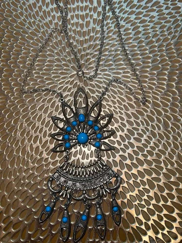 Faux Turquoise Silver Metal Fringe Necklace, Squash Blossom Design, Statement Necklace